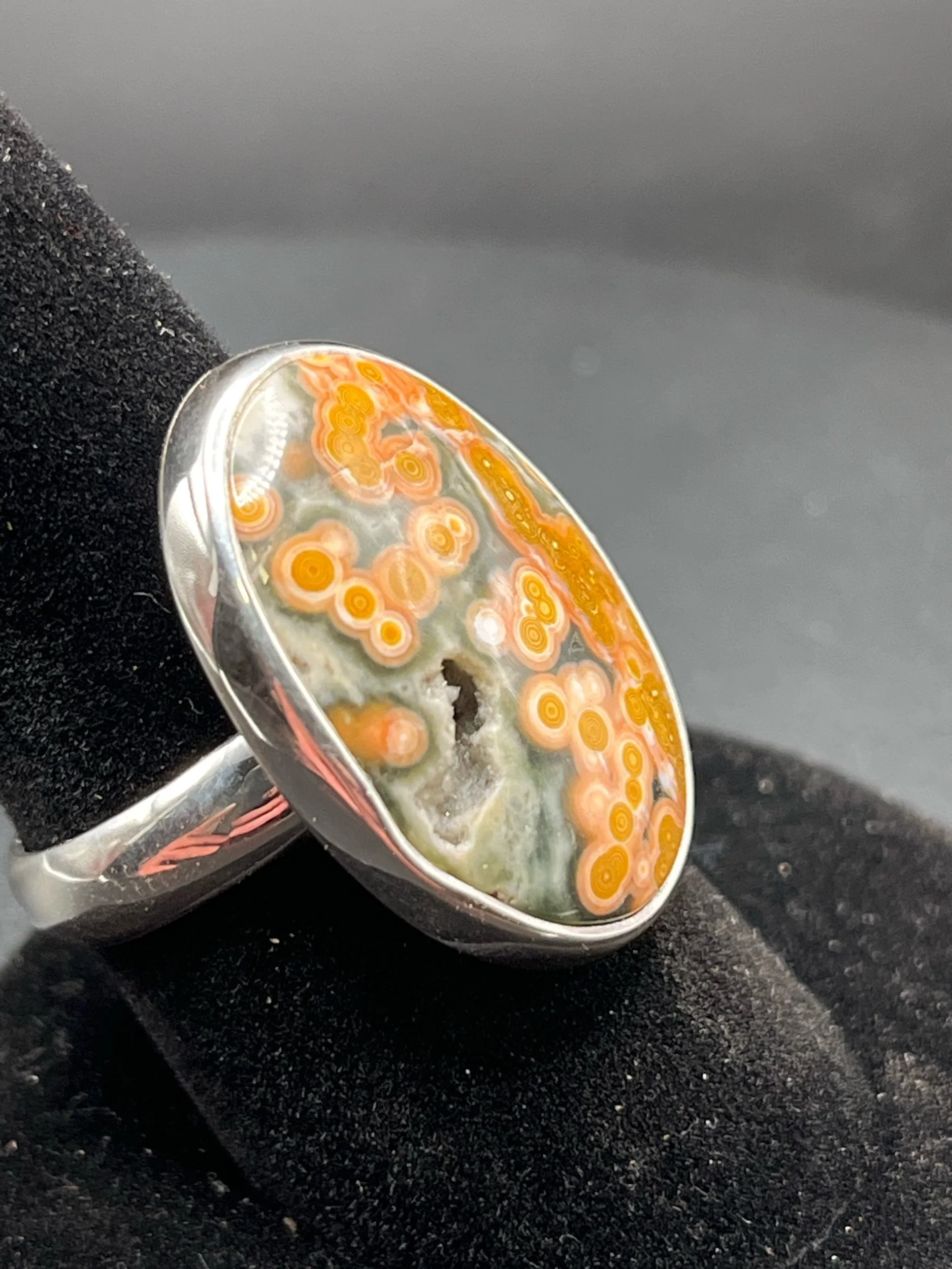 Shop › Ocean Jasper handmaid’s Silver Ray Ocean Jasper handmaid’s Silver Ray $175.00 Amazing large piece of ocean Jasper showcasing a crystal pocket inside of the stone. Set in sterling silver ring size 10 1/4 Amazing large piece of ocean Jasper showcasing a crystal pocket inside of the stone. Set in sterling silver ring size 10 1/4 Add To Cart Added!